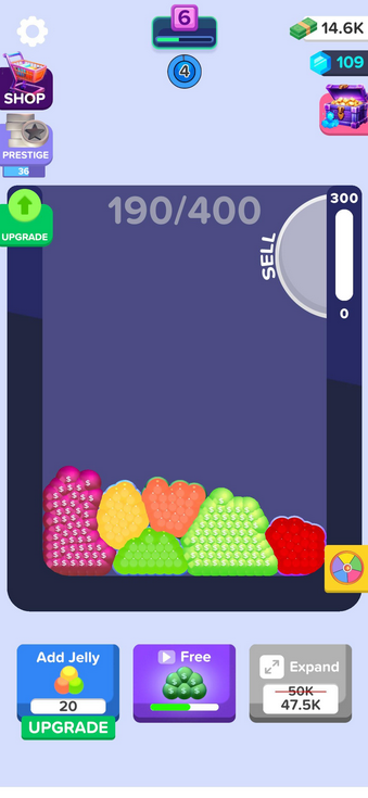 Управление осуществляется пальцем - вы водите им по экрану, пытаясь соединить одинаковые фигуры. Когда два одинаковых желе встречаются, они превращаются в новое, более ценное и визуально другое желе. Например, два зеленых желе объединяются, и появляется голубое. Постепенно вы получаете возможность открывать больше пространства для новых элементов. Это дает больше свободы для комбинаций. Объединенные желе можно продавать за игровую валюту. Деньги тратятся на покупку новых желе или улучшение игрового поля. Также улучшения можно приобрести, если у вас установлен мод на бесплатные покупки.Цикличность