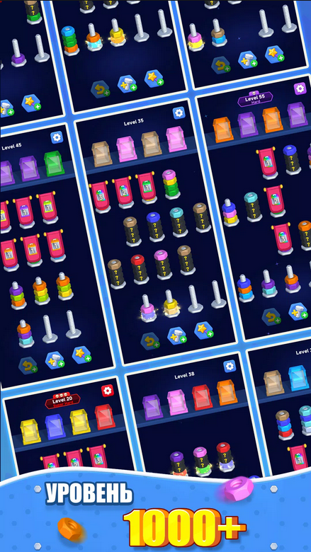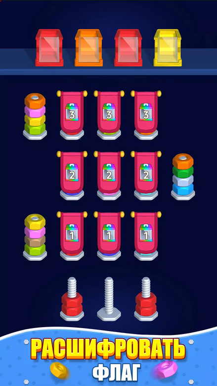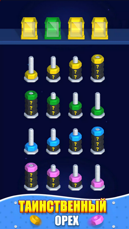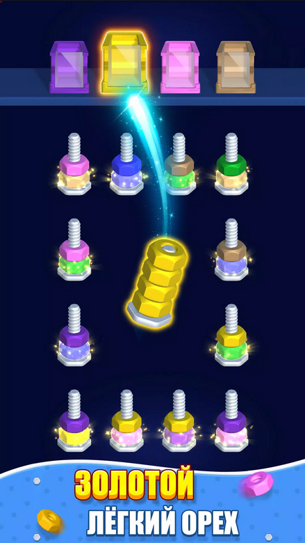 Вам нужно распределять цветные гайки по болтам такого же цвета. Выбирайте гайку одного цвета и перемещайте ее на болт, где верхняя гайка такого же цвета, как и та, которую вы выбрали. Если цвета будут отличаться, вы не сможет совершить перенос. Группа гаек одного цвета переносится сразу вся. Нужно продумывать последовательность переноса гаек, иначе есть шанс зайти в тупик. Тогда придется начинать уровень с начала или воспользоваться подсказками. Первые уровни позволяют ознакомиться с механикой игры, понять правила и как все работает. Но потом появляются сложные комбинации, болтов может быть много, а количество ходов ограничено. Один неверный ход загонит вас в угол.Привлекательная визуализация