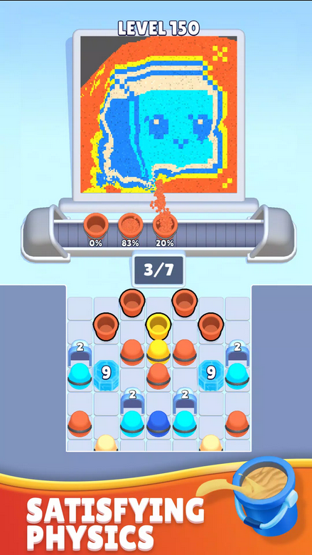 Наполняйте ведра цветным песком и отправляйте по конвейерной ленте. Затем подбирайте ведерки с песком нужного цвета и высыпайте, тапнув пальцем по экрану телефона. С каждым ударом картина будет рассыпаться у вас на глазах, превращаясь во что-то новое. Фактически на экране вашего телефона окажется живая песчаная картина с завораживающими эффектами и успокаивающей визуализацией.