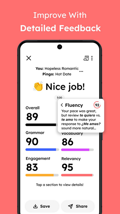 Pingo AI ориентировано на пользователей разного возраста и уровня подготовки. Искусственный интеллект даже может создавать персонализированные уроки с учетом вашего уровня знаний, темпа изучения и способности усваивать материал. Также в приложении есть режим репетитора, в котором вы можете попрактиковаться языку с «личным» педагогом. Это позволит вам закрепить полученные знания и заговорить быстрее и беглее без скучных заучиваний. Присоединяйтесь к нашей армии полиглотов. Дерзайте, добивайтесь успехов в учебе и успешно применяйте полученные знания на практике!