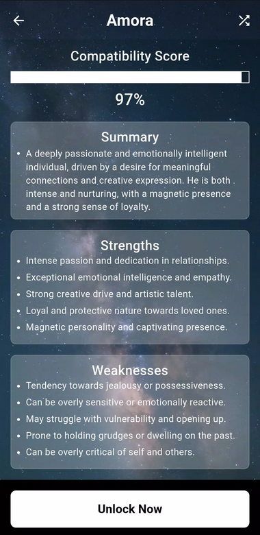 Amora найдет вам идеального напарника, настоящую родственную душу для романтических взаимоотношений, общения и совместного времяпрепровождения. Для этого утилита использует древние знания астрологии и современные технологии искусственного интеллекта. Именно благодаря этому сочетанию и удается достичь идеального результата: найти по настоящему родственную душу, просчитать совместимость с потенциальным спутником жизни или наладить отношения в паре. Другими словами, Amora - это ваш виртуальный консультант и проводник по миру любви. На основании предоставленных вами данных искусственный интеллект создаст ваш виртуальный профиль личности и на его основе подберет идеальный вариант. Благодаря обширному набору функций утилита способна удовлетворить самые изощренные потребности пользователей. Откройте к ним доступ с помощью мода на все разблокировано и приступайте. Приложение определит уровень совместимости вашей пары, посоветует как лучше вести себя в той или иной ситуации, как выйти из тупика в отношениях и добавить в них романтики. Более миллиона пользователей уже доверили ему свои судьбы и живут счастливо своими избранниками и избранницами. Присоединяйте к ним и вы, и сделайте свою романтическую жизнь яркой и наполненной эмоциями и впечатлениями.