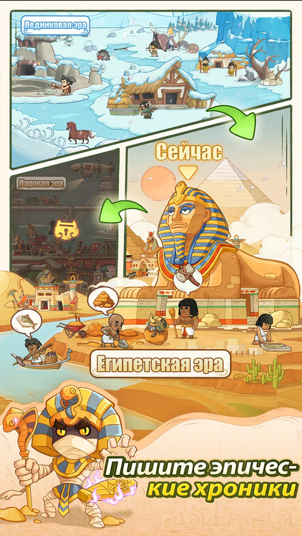 На первых этапах игры ваше племя живет в суровых условиях Ледникового периода. Нужно думать о жилье, еде и защите. Еду можно добывать из разных источников - собирать ягоды и коренья, охотиться на диких зверей, заниматься рыбалкой. Следует заготавливать древесину и добывать полезные ресурсы и материалы или покупать их с модом на бесплатные покупки. Постепенно племя переходит в другие эпохи, где условия для развития будут иные. Открытие новых способов добычи позволит эффективно охотиться. Строительство также выйдет на новый уровень, появятся улучшенные инструменты, позволяющие строить больше новых зданий и сооружений. Постепенно сможете строить целые города, выстраивать оборону и осваивать новые территории. Можно выбирать план развития - агрессивное нападение или дипломатические переговоры.Бедствия